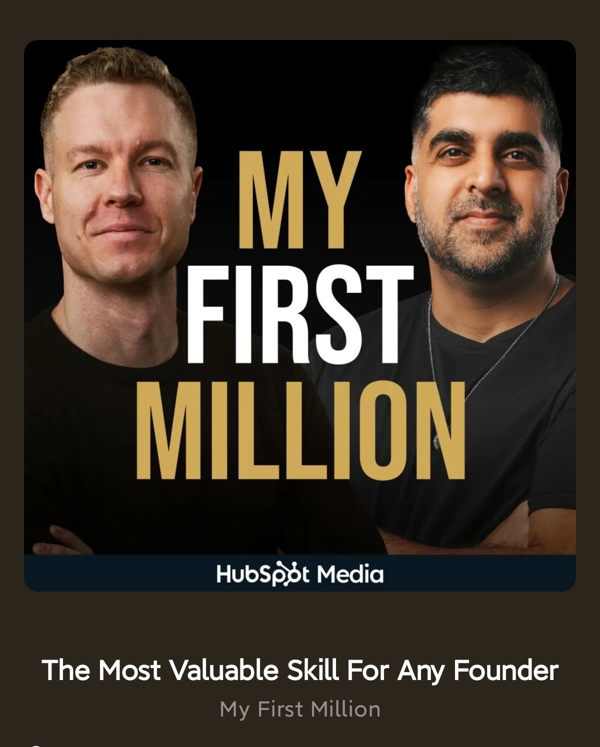 这期想给你分享 My First Million 上周更新的一集节目:The Most Valuable Skill for Any Founder,之前我们在第 45、57、67、76、93、112 封邮件中都分享过 MFM 的内容。